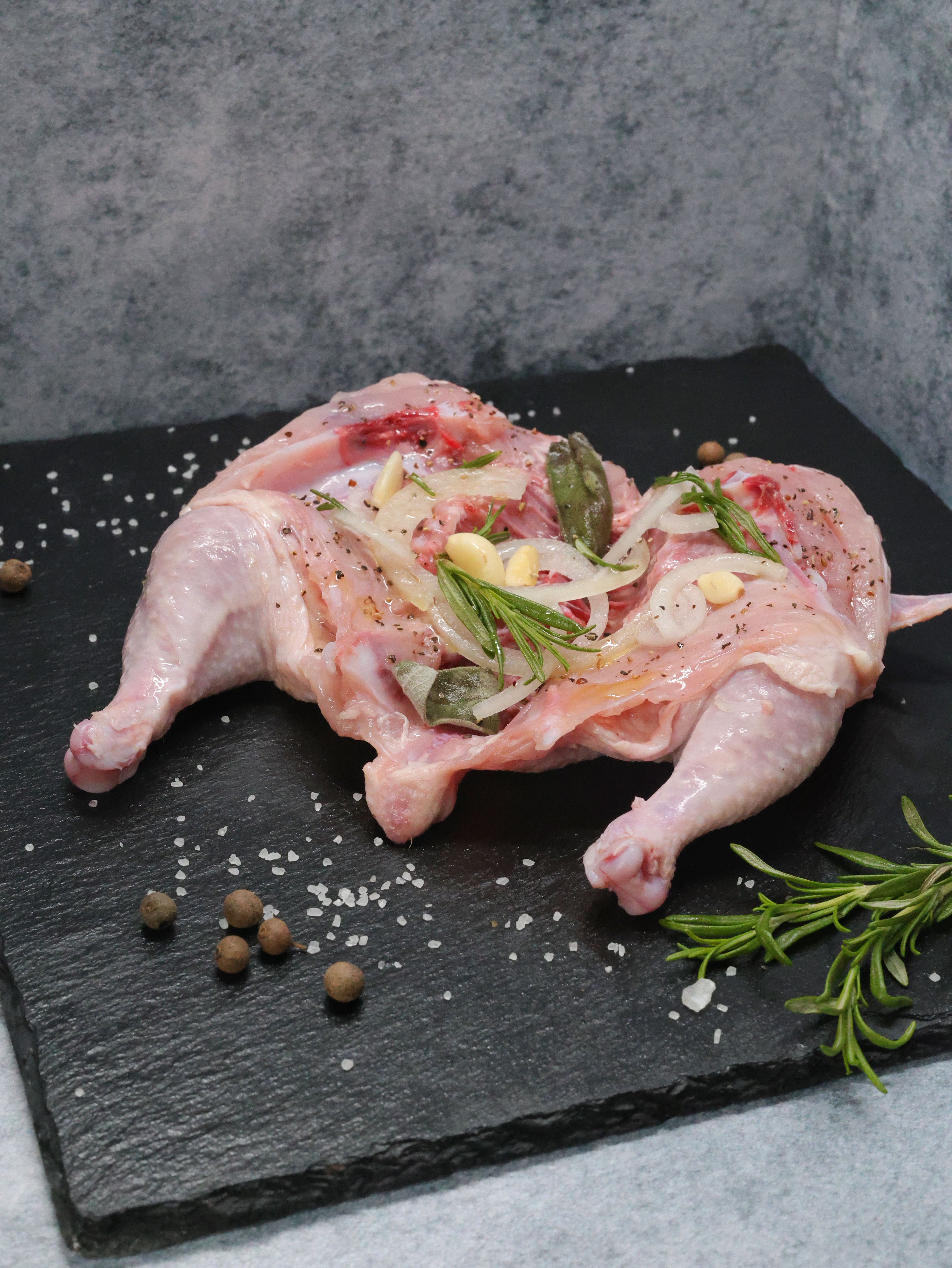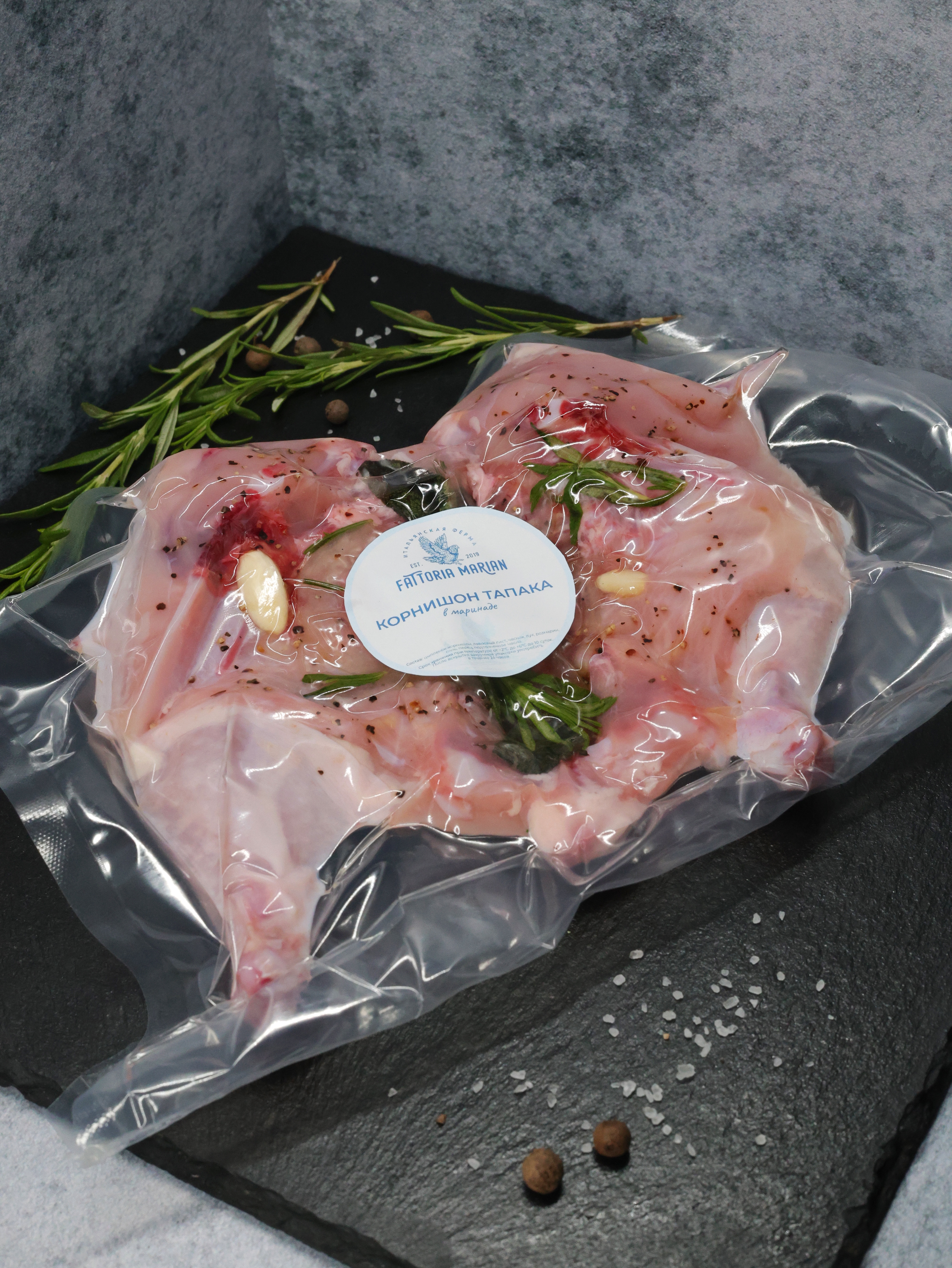 Состав: цыпленок-корнишон, лавровый лист, чеснок, лук, розмарин, соль, перец, подсолнечное масло.